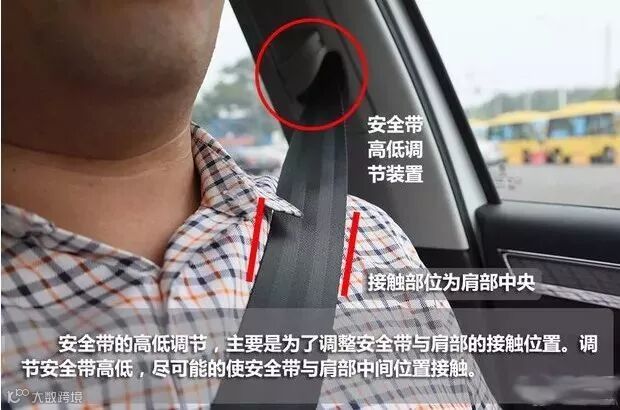 安全带的高低调节,主要是为了调整安全带与肩部的接触位置。调节安全带高低,尽可能的使安全带与肩部中间接触,不能过于接近颈部也不能过于靠外,以避免安全带在碰撞当中对肩部以及颈部的损伤。
