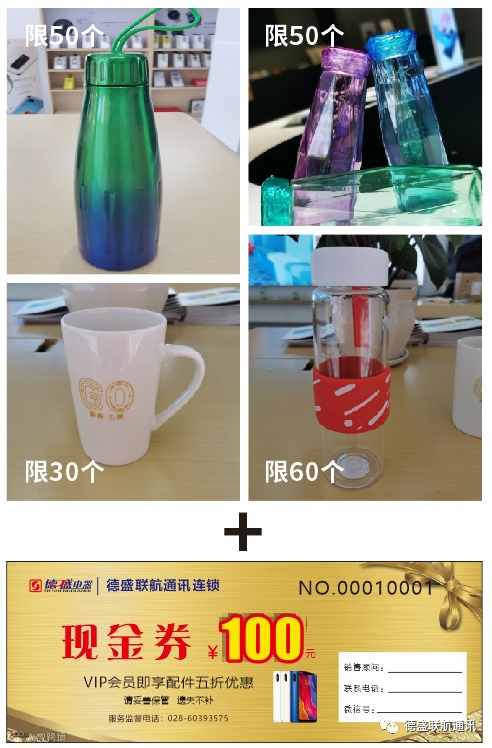 转发有礼:转发活动内容,朋友圈分享两天以上,免费领取精美水杯一个+100元购机抵用券一张(凭截图19日,进店领取)