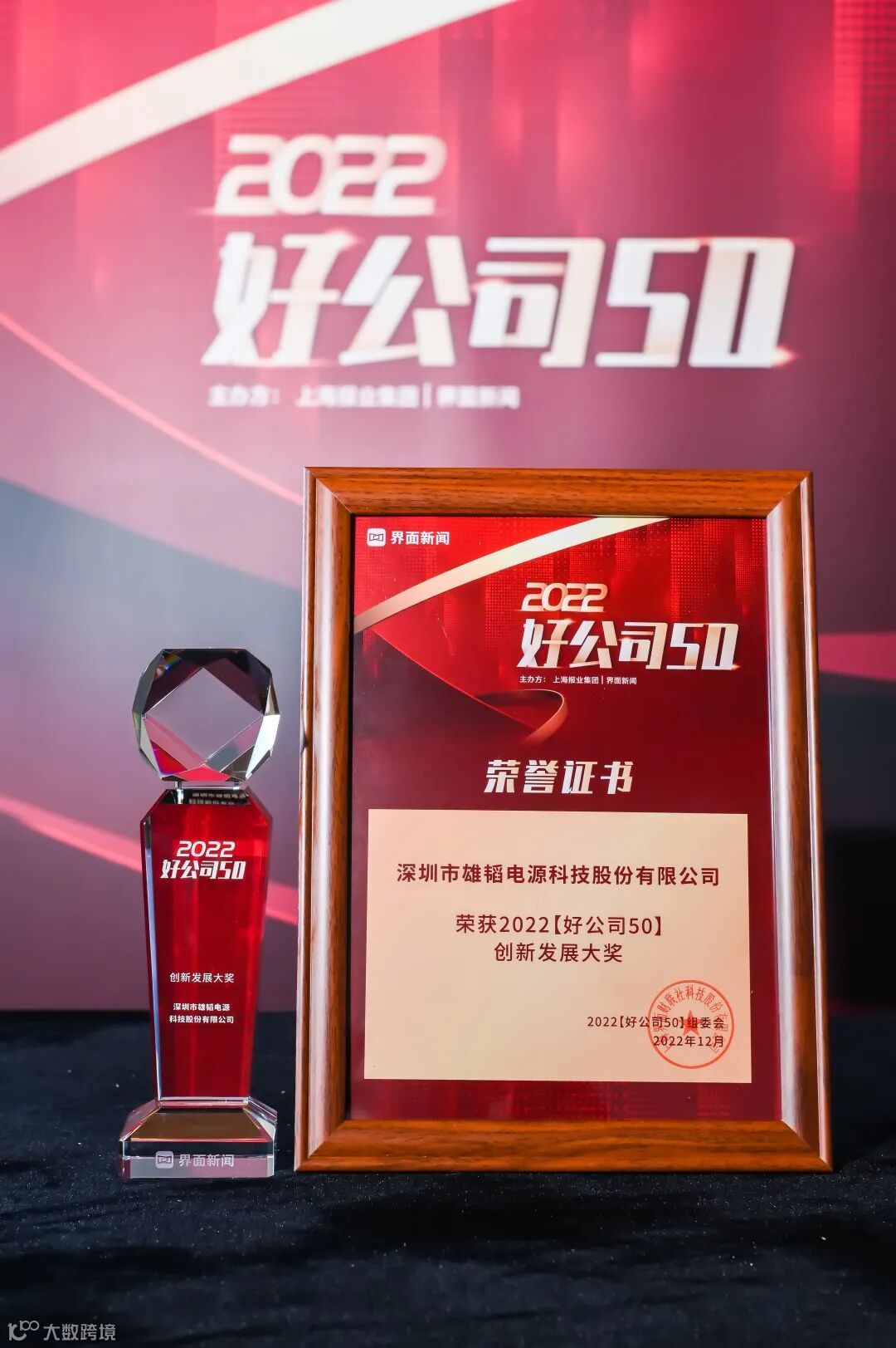12月20日,上海报业集团|界面新闻在上海中心举办了【2022好公司50】颁奖典礼,并正式公布了年度TOP50年度荣誉榜单。雄韬股份突破重围脱颖而出,荣获创新发展大奖,彰显了雄韬股份的创新能力与领先实力。
