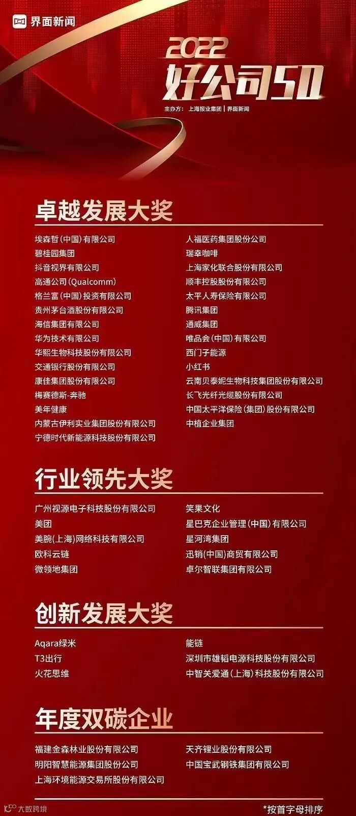 【好公司50】由上海报业集团|界面新闻发起。评选旨在评选中国市场上的卓越企业,在综合考量市场表现、创新活力、公司治理、社会声誉的基础上,通过多个环节全面衡量企业综合素质,同时依托界面新闻全行业覆盖采编资源,携手多位知名高校学者、业界专家与行业分析师,确保评选的独立性、公正性、权威性,展现优秀企业于变局下临阵不慌的战略纵深与韧性。自7月正式启动申报以来,来自39个细分行业的500余家候选公司,经过近半年的大众投票、市场表现、创新活力、公司治理、社会声誉等方面的角逐,最终50家优质企业突破重围荣登年度荣誉榜单。