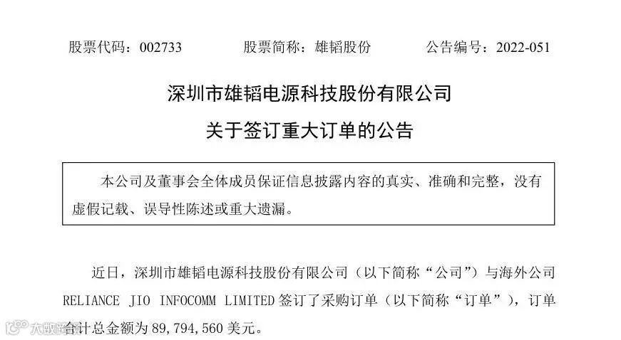 近日,深圳市雄韬电源科技股份有限公司(以下简称“雄韬股份”)与海外公司RELIANCE JIO INFOCOMM LIMITED 签订了采购订单,订单合计金额为 89,794,560 美元。
