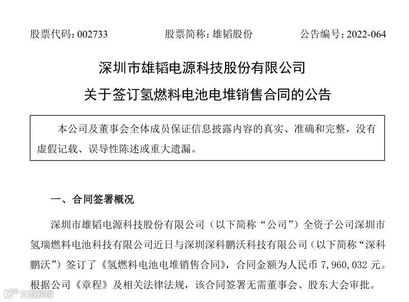 近日,深圳市雄韬电源科技股份有限公司(以下简称“雄韬股份”)全资子公司深圳市氢瑞燃料电池科技有限公司(以下简称“雄韬氢瑞”)与深圳深科鹏沃科技有限公司签订了《氢燃料电池电堆销售合同》,合同金额为人民币 7,960,032 元。