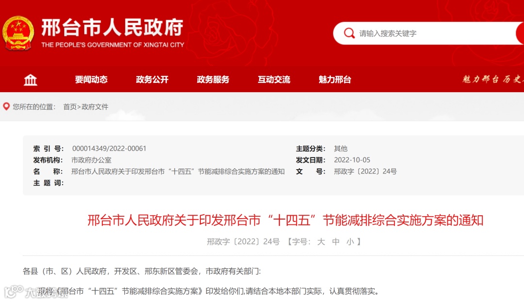10月5日,河北邢台人民政府印发邢台市“十四五”节能减排综合实施方案。