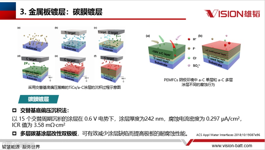 镀层有金属镀层、碳膜镀层、氮化物膜、碳化物膜。其中碳膜镀层:交替基底偏压沉积法:以15个交替周期沉积的涂层在 0.6 V 电势下,涂层厚度为242 nm,腐蚀电流密度为 0.297 μA/cm²,ICR 值为 3.58 mΩ·cm²;多层碳基涂层改性双极板,可有效减少涂层缺陷而提高极板的耐腐蚀性能