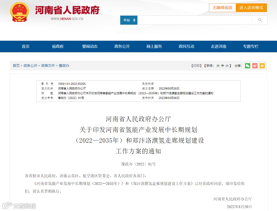 9月6日,河南省人民政府发布《关于印发河南省氢能产业发展中长期规划(2022—2035年)和郑汴洛濮氢走廊规划建设工作方案的通知》(以下简称《规划方案》)。