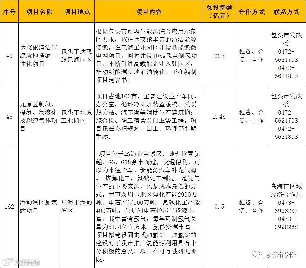 日前,内蒙古发改委发布《2020年重点经济合作项目(第一批)》,193个项目上榜,投资总额3778亿元,其中有三个项目涉及风电制氢、氢液化加氢站建设,投资额达25.46亿元,详情见下表: