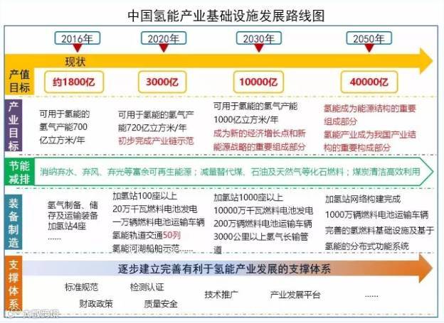据《蓝皮书》路线图规划,到2020年,我国氢能产业基础设施发展将取得重大突破。其中,以能源形式利用的氢气产能规模将达到720亿m3;加氢站数量达到100座;燃料电池车辆达到10000辆;氢能轨道交通车辆达到50列;行业总产值达到3000亿元。到2030年,氢能产业将成为我国新的经济增长点和新能源战略的重要组成部分,产业产值将突破10000亿元;加氢站数量达到1000座,燃料电池车辆保有量达到200万辆,高压氢气长输管道建设里程达到3000km,氢能产业基础设施技术标准体系完善程度迫近发达国家水平,氢能与燃料电池检验检测技术发展及服务平台建设形成对氢能产业发展的有效支撑。
