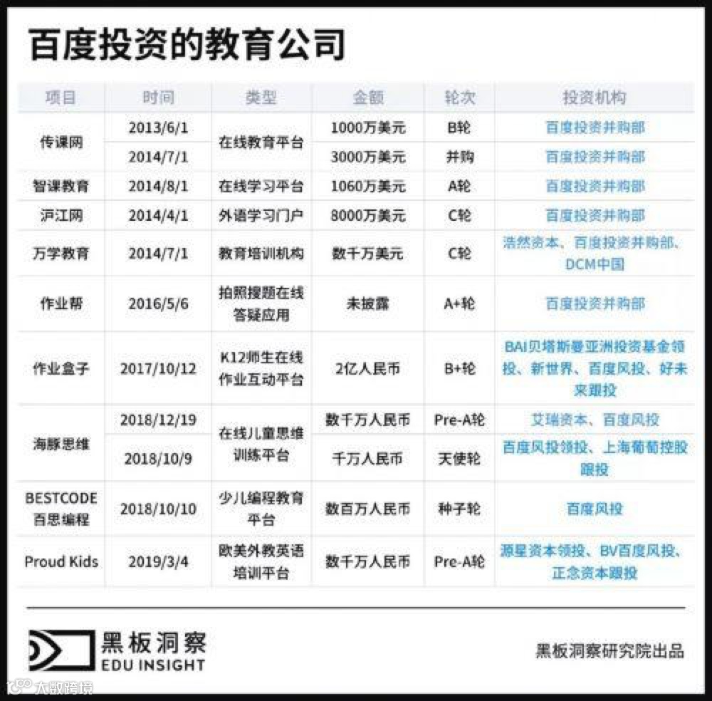 虽然百度从2013年起就开始投资教育项目,但这些项目大多偏早期,且为技术型导向型,目前只有从百度拆分出的作业帮和投资的作业盒子跑了出来,但近两年也被卷入不少负面新闻中。