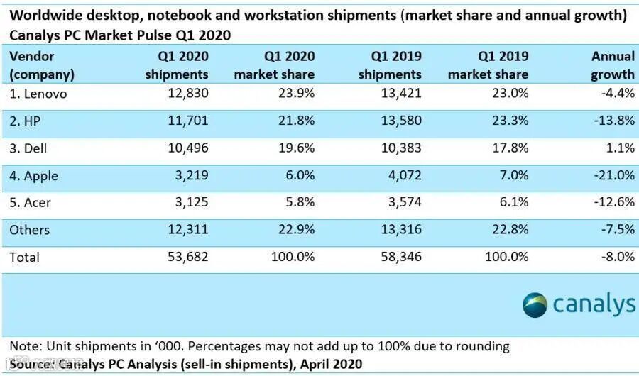 事实上,疫情期间,PC的需求是在上升的。但由于第一季度产能跟不上,导致实际出货量数据下滑。市场调研机构Canalys公布的研究报告显示,2020年第一季度全球PC出货量为5368万台,与2019年同期的5835万台相比下降了8%,这是自2016年以来跌幅最大的一次。