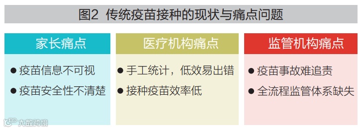 巩燚是海尔的一名技术开发人员,偶尔一次带孩子去打疫苗,发现疫苗接种门诊的冷链设备落后,存在很大的安全隐患。经过多次现场调研以及与多名家长、医疗监管机构管理者的沟通和交流,巩燚发现在传统的疫苗接种模式中,家长、接种点和监管机构都有各自的痛点(见图2)。比如,家长们对疫苗的信息几乎一无所知,是否安全也不确定;基层预防接种门诊冷链设备普遍落后、接种环节人工操作强度大易疲劳、出入库未实现信息化,医务人员每天接种工作完成后需要对接种数据、库存数据等进行人工统计、核对,效率低、易出错,且信息不能及时上传疾控中心等监管部门。