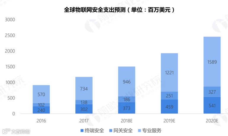 据Gartner调查,近20%的企业或者相关机构在过去三年内遭受了至少一次基于物联网的攻击。为了防范安全威胁,Gartner预测2020年全球物联网安全支出将达到26亿美元;其中,终端安全支出约541百万美元,网关安全支出约327百万美元,专业服务支出约1589百万美元。
