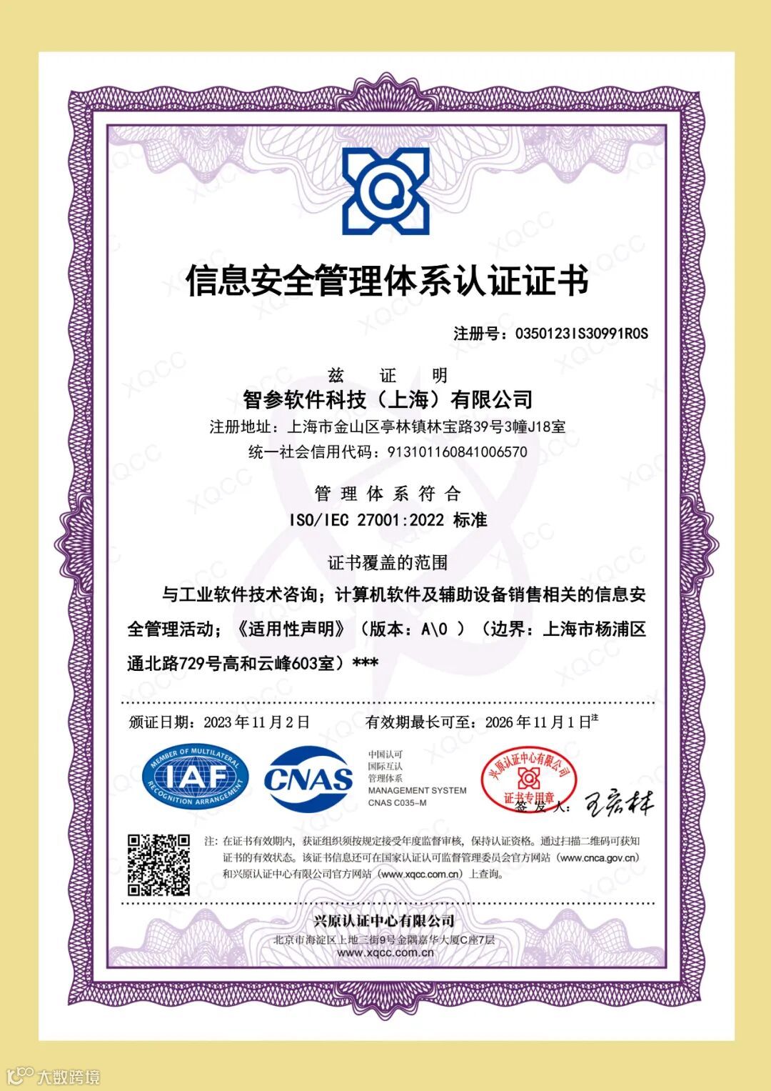 ISO 27001是一种国际通用的信息安全管理体系标准,它为组织提供了一套完整的信息安全管理体系框架和实施指南。通过该认证,意味着智参科技已经具备了世界领先的信息安全保障能力和水平,能够为客户提供更加安全、可靠的服务。