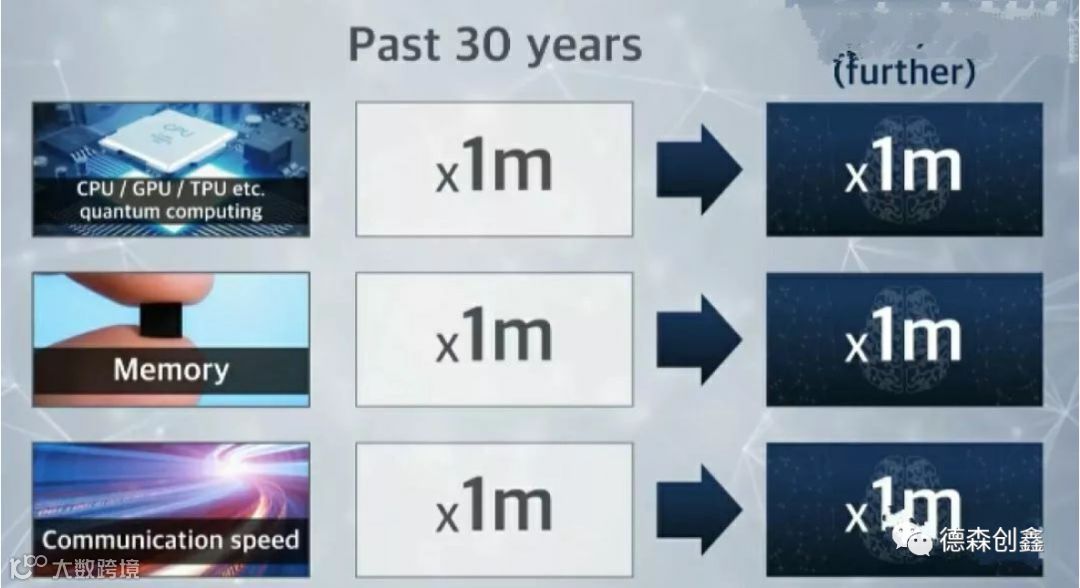 各位,处理器的运算能力,记忆体的储存能力,互联网的传输能力,在这30年来,都成长了100万倍。30年来,成长的幅度是这样,那再过30年呢?