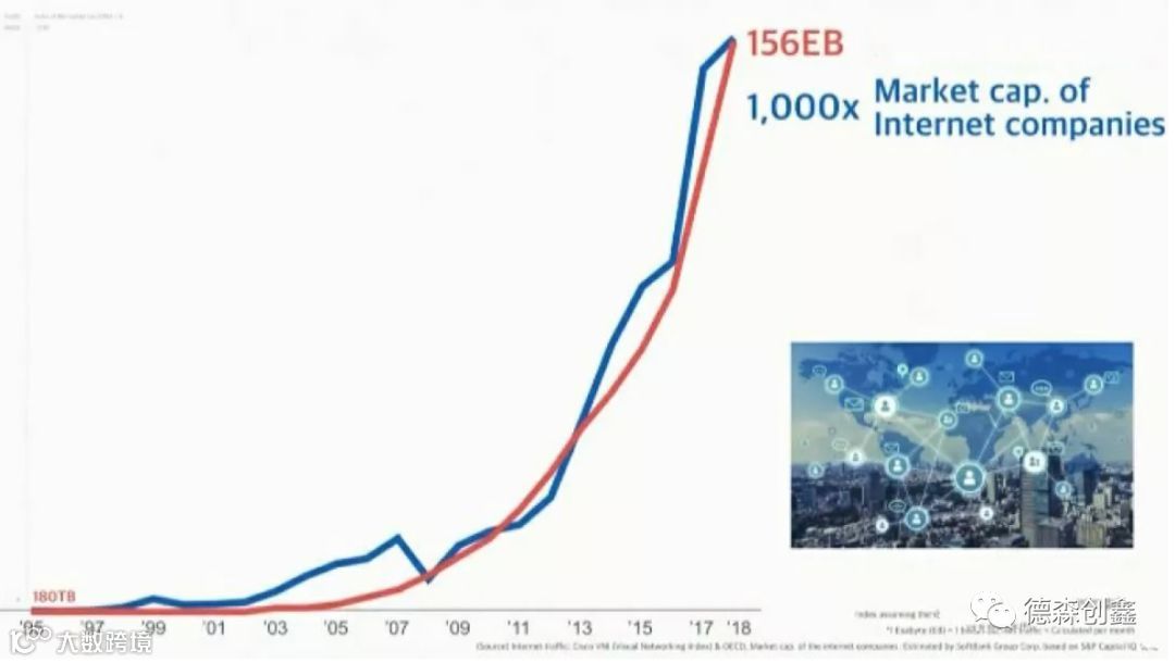这是全球网络的流量,横坐标是年份。红色的线代表流量。从最早的1995年到2018年,网络的流量,增加了100万倍。我们再来看另一条蓝色的线。蓝色的线,表现的是23年来全球互联网公司的市场价值(市值)。