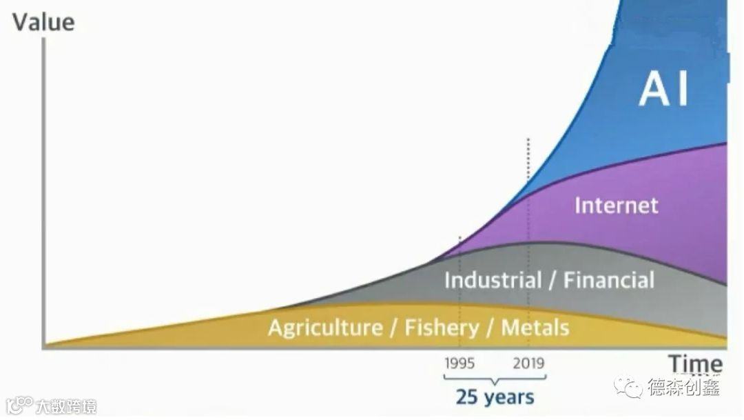 底部的黄色,代表农业,其价值与时间的比例一目了然;灰色代表工业,紫色代表互联网,也就是我们正处的时代;而未来最有价值的东西,是属于蓝色的,是属于AI的。