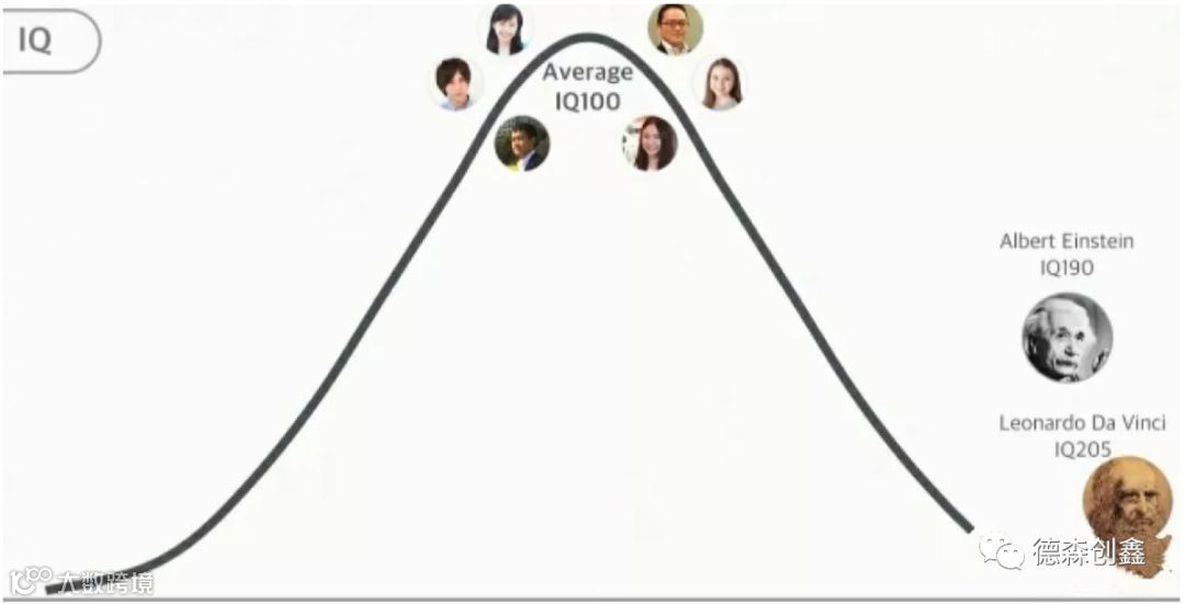 上面这张图,人类正常的智商(IQ),都在100左右,罕见的天才爱因斯坦190,达芬奇205。那么请问,未来AI的智商,会是多少呢?