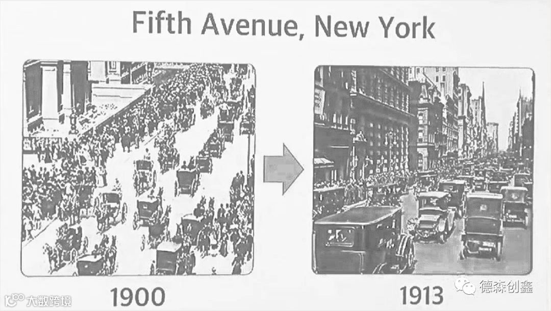 这是美国纽约的第五大道,左边那张是1900年的,你看到一辆汽车,和九十九匹马车。而右边的,同样的地方,13年后,你看到的是九十九辆车,和一匹马车。