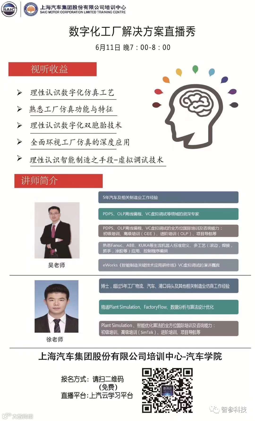 2019年6月11日晚7:00-8:00,智参科技吴明山老师和徐振宇老师将给大家带来《数字化工艺仿真及虚拟调试》以及《工厂与物流仿真案例分析》的干货分享,文末有福利哦~~~