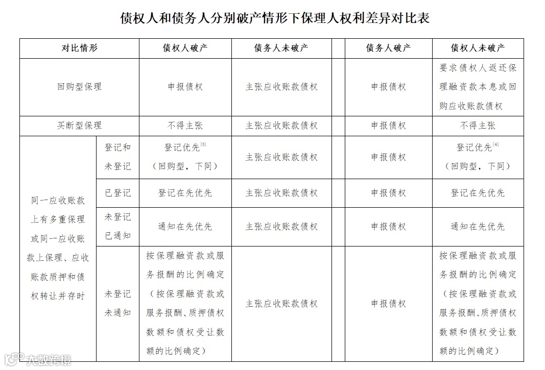为便于实务操作,以下表格对比债权人破产与债务人破产两种情形下保理人权利要点: