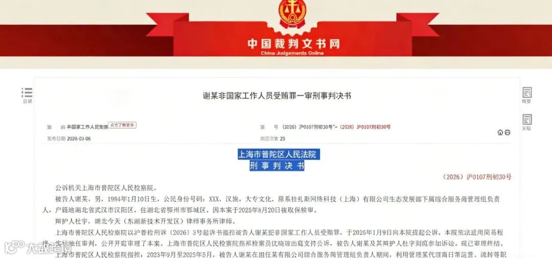 互联网企业内部腐败问题持续引发关注。近日,上海市普陀区人民法院公布的一则刑事判决书,披露拉扎斯网络科技(上海)有限公司(饿了么运营主体)一名员工谢某的受贿案。