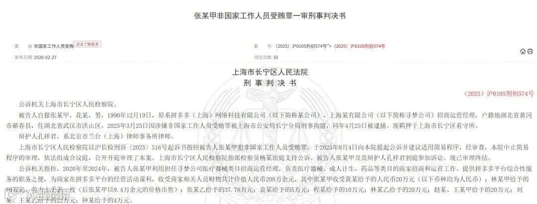 类似案例并非孤例。裁判文书网信息显示,原拼多多及上海寻梦公司招商运营经理张某甲,亦因在医疗器械类目商家招商与运营中收受贿赂被查。