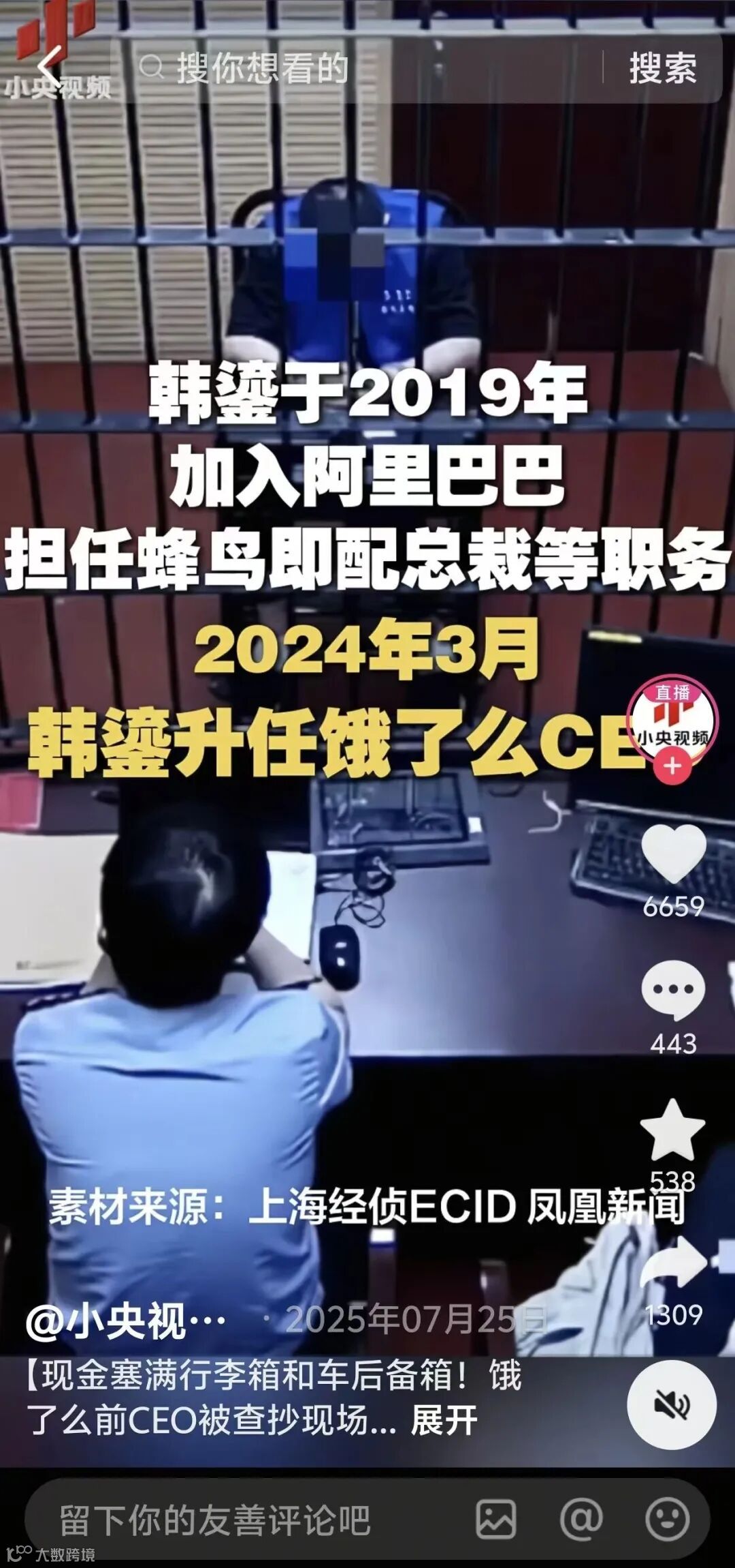 涉案人韩鎏(花名“昊宸”),曾任饿了么资深副总裁、蜂鸟即配总裁,2024年3月升任饿了么CEO,2025年2月调整为分管即时物流中心负责人。