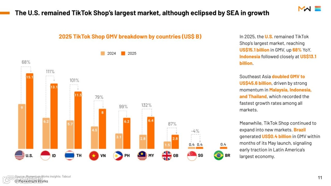 作为TikTok Shop最大区域市场,东南亚持续拉动平台增长。据Momentum Works与Tabcut联合报告,2025年TikTok Shop东南亚GMV达456亿美元,同比增长100%。