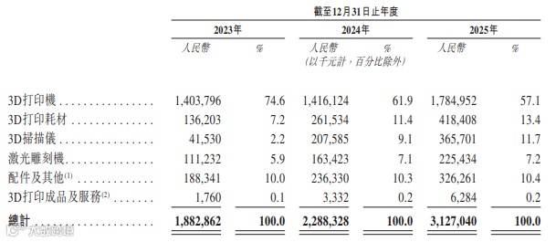 2023—2025年,创想三维营收持续增长,分别为18.83亿元、22.88亿元、31.27亿元;毛利率保持稳定,分别为31.8%、30.9%、31.2%。