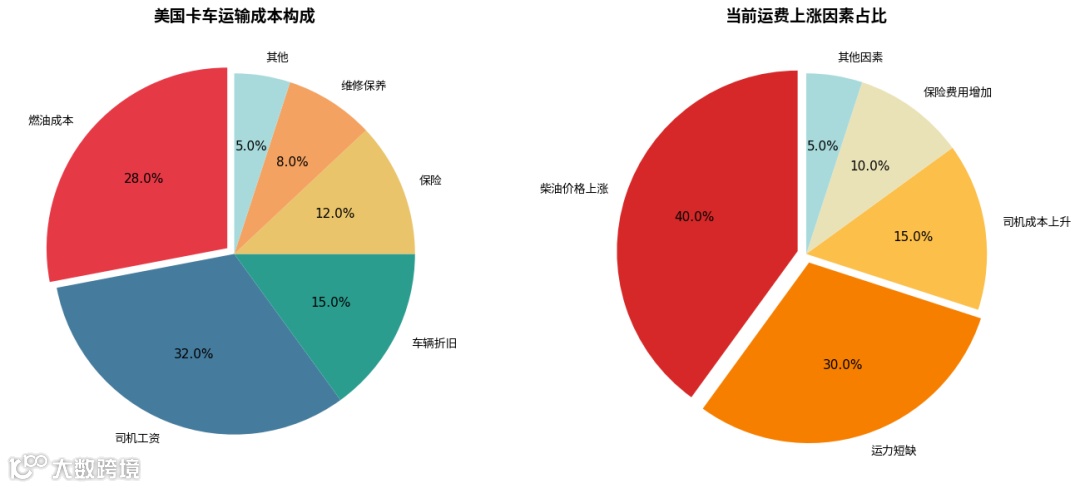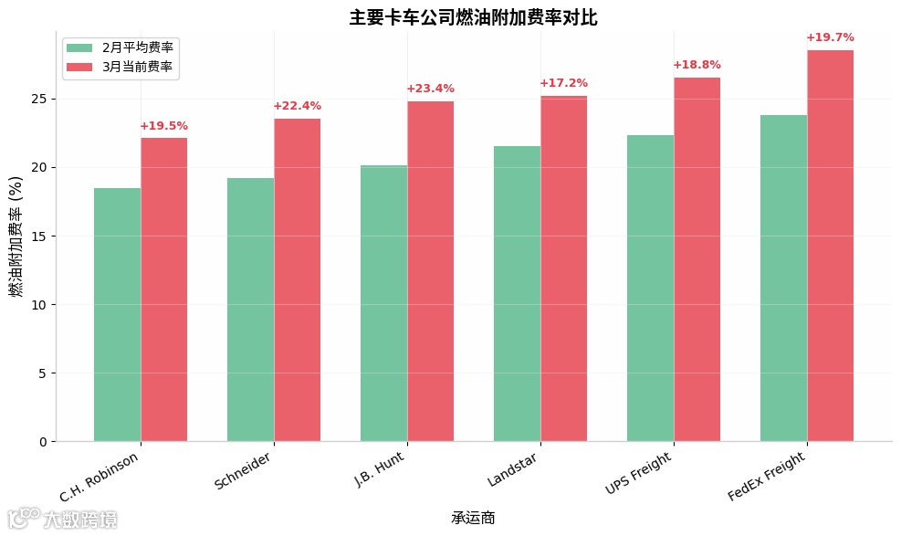 燃油成本占美国卡车运输运营成本的25%–30%。油价上涨直接推高运营压力,主流卡车公司已将燃油附加费(Fuel Surcharge)较2月平均上调12%–18%。