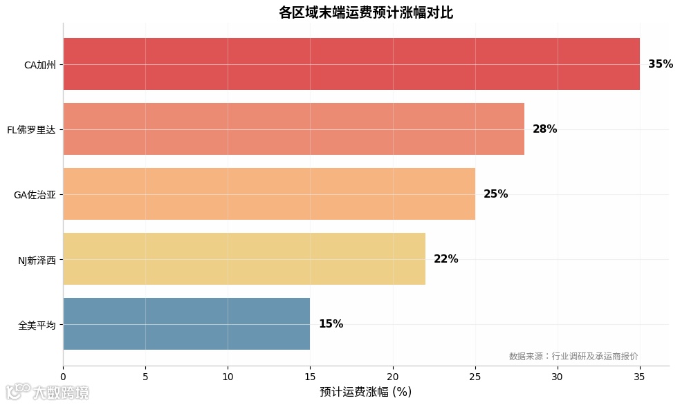 新泽西(NJ)、佐治亚(GA)、佛罗里达(FL)等区域派送费率涨幅高于全国均值,相关线路卖家需提前评估成本影响。