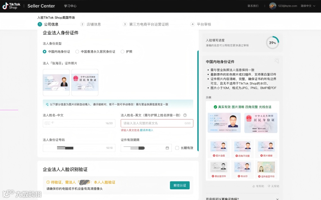 提交法人身份信息,并完成实时人脸识别认证。