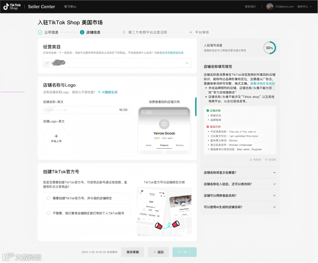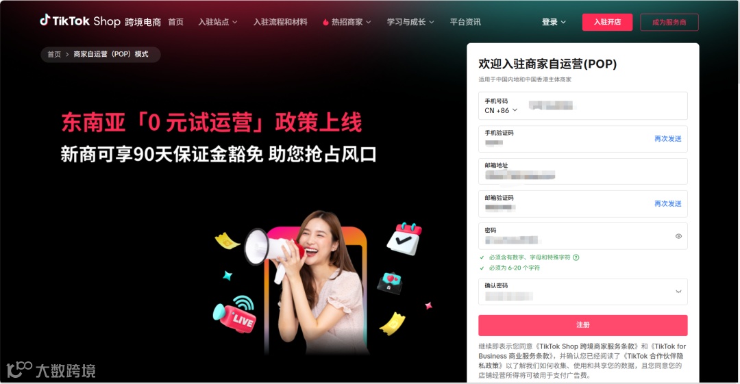访问TikTok Shop官网,使用未注册过的手机号和邮箱完成在线注册。