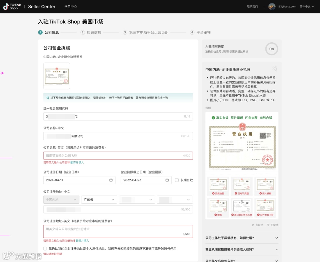 按系统提示上传营业执照并填写企业基本信息。