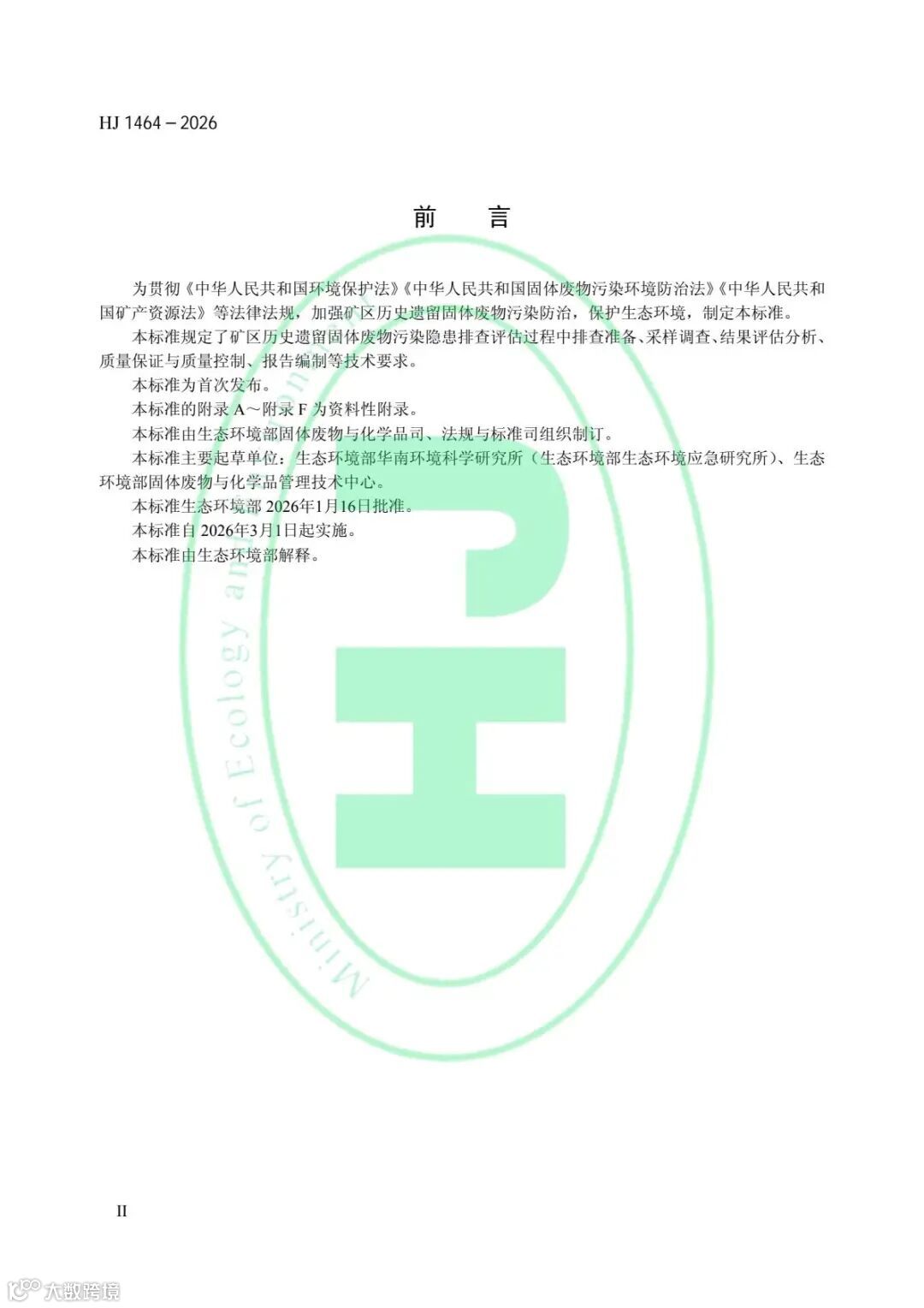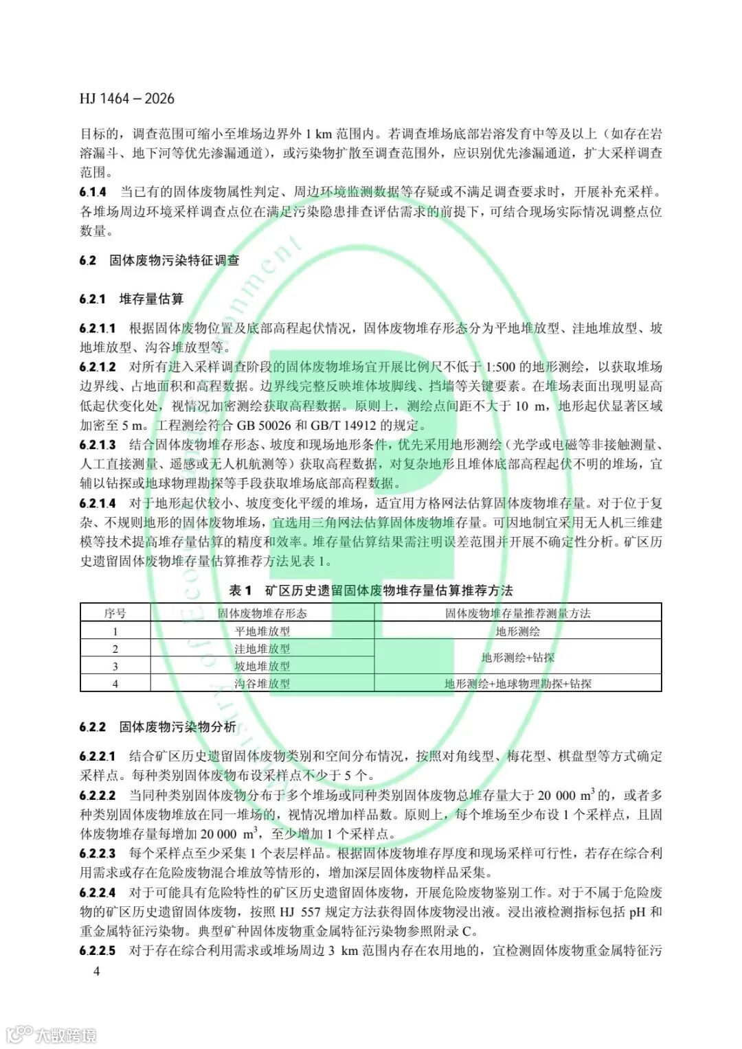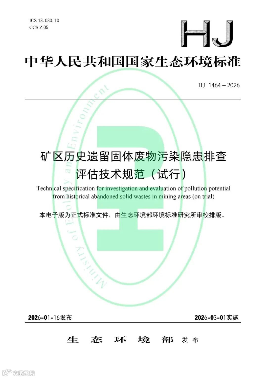 四、《矿区历史遗留固体废物污染隐患排查评估技术规范(试行)》(HJ 1464-2026)