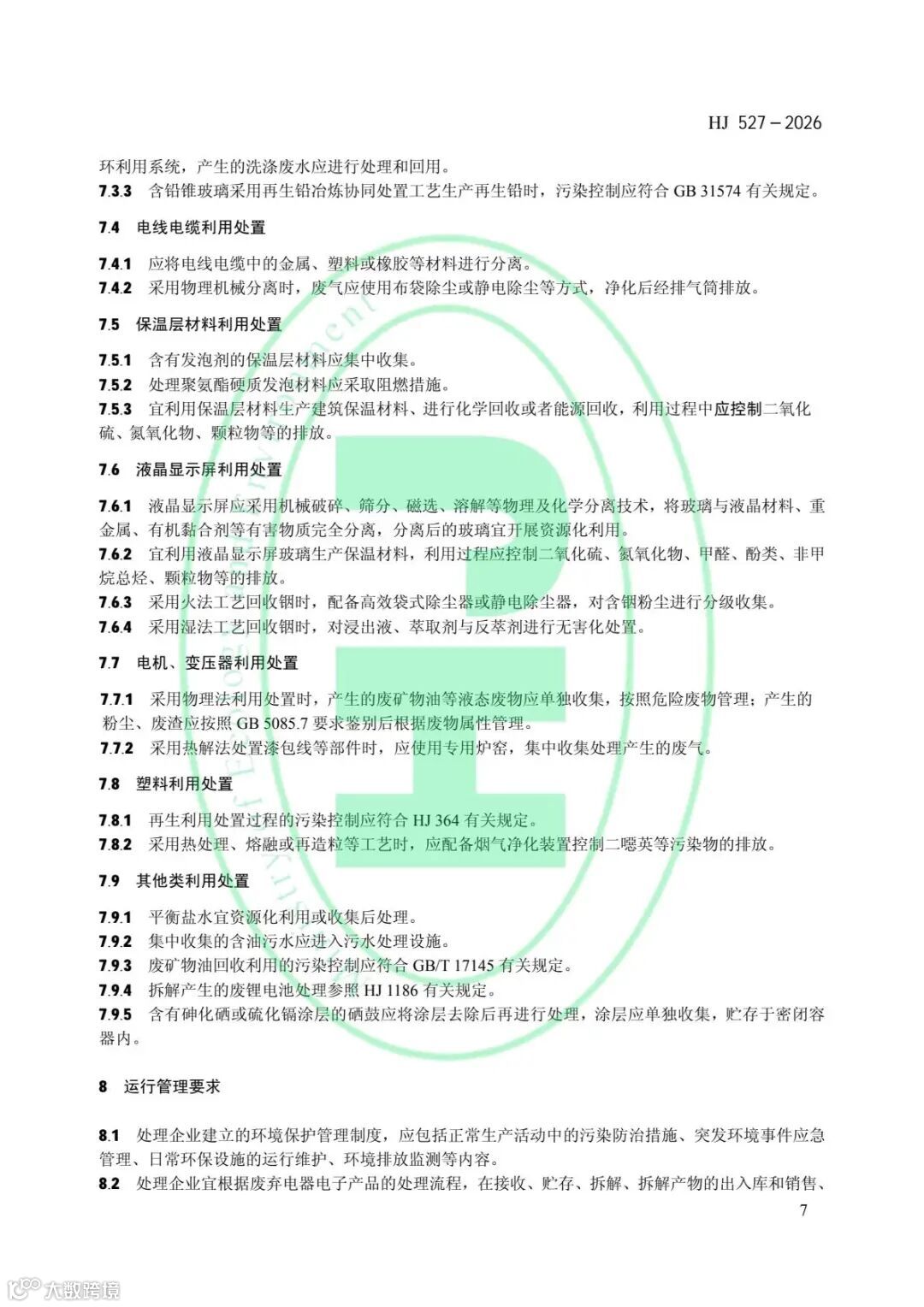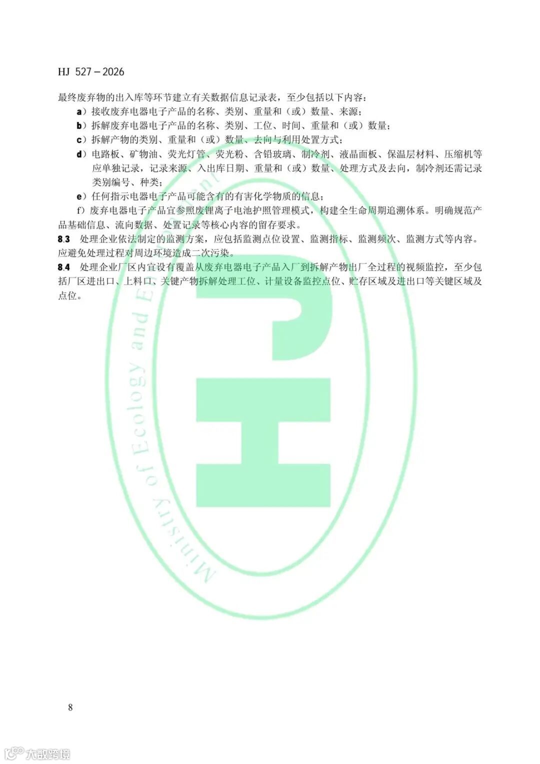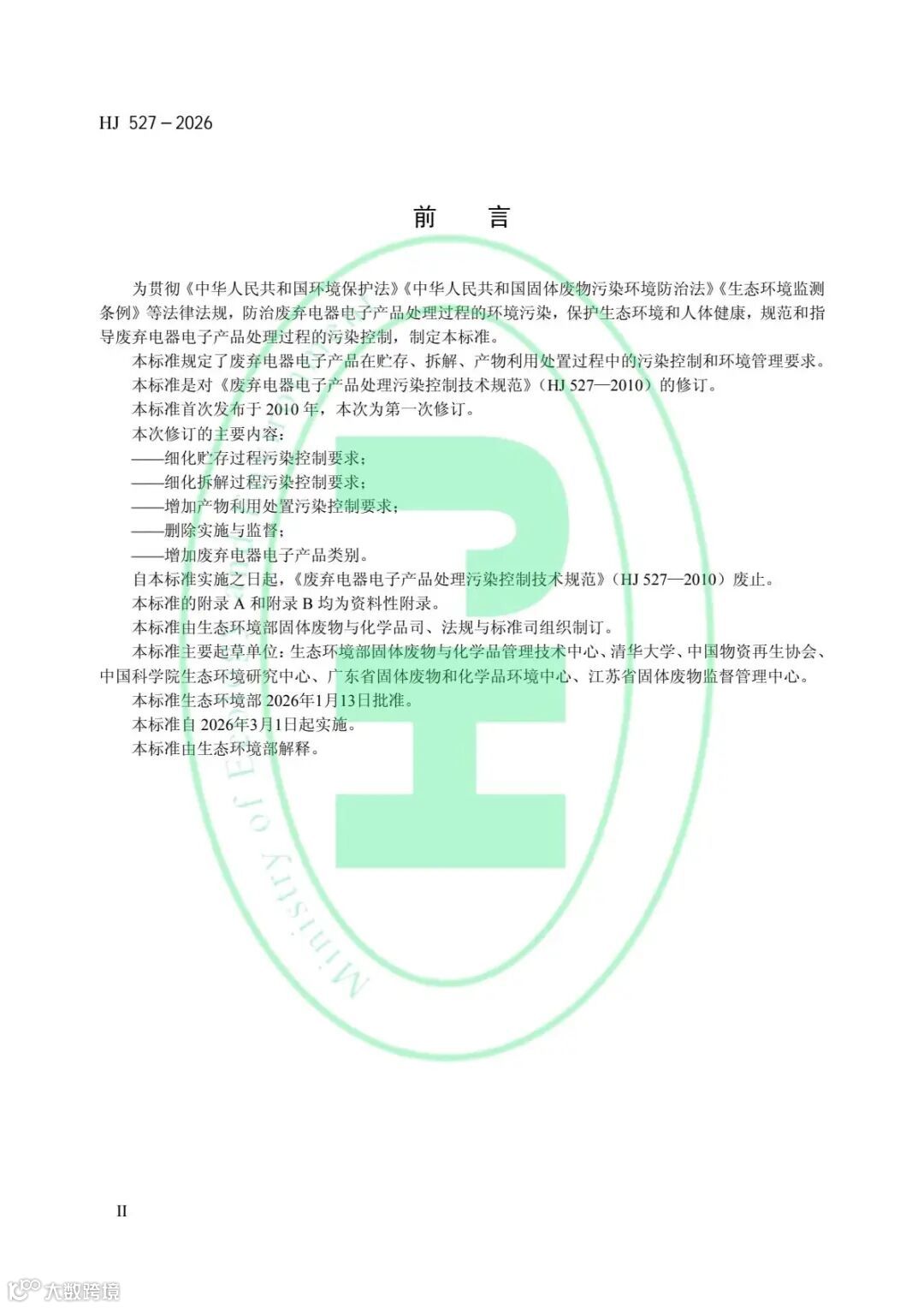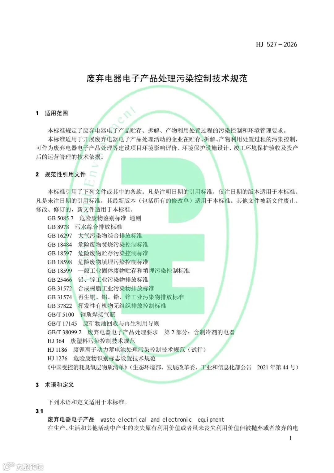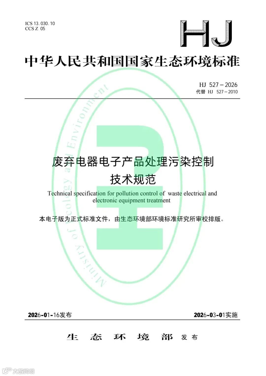 以上标准自2026年3月1日起实施。自标准实施之日起,《废弃电器电子产品处理污染控制技术规范》(HJ 527-2010)废止。