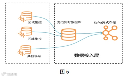 数据采集系统是数据平台的入口,负责接收所有场站的时序数据和震动数据。通过实时数据库的汇聚功能,将区域的实时数据汇聚到数据中心。考虑到后续随着装机量的大量增长,平台引入了Kafka作为数据采集的核心基础设施,如图5所示。