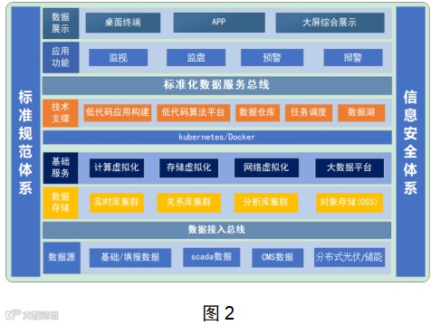 新能源智慧运维系统软件架构需采用分层设计理念,由下至上分为数据源、数据接入总线、数据存储、基础服务、技术组件、应用功能、数据展示,以及符合标准规范体系和信息安全体系,如图2所示。
