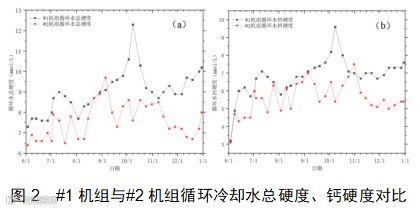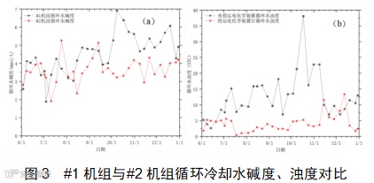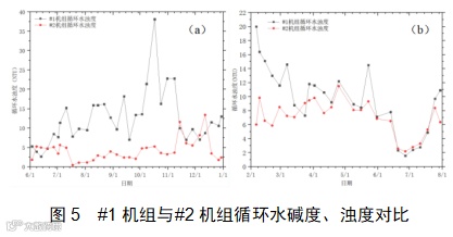 从图4可以看出,当循环冷却水系统浓缩倍率提高时,投运电化学装置且浓缩倍率较高的#2机组循环冷却水系统总硬度、钙硬度均比未投运电化学装置且浓缩倍率较低的#1机组循环水系统略高。#1机组循环冷却水系统平均总硬度、钙硬度分别为8.93mmol/L、6.64mmol/L,#2机组循环冷却水平均总硬度、钙硬度分别为9.61mmol/L、6.90mmol/L;从图5(a)可以看出,#2机组循环冷却水系统碱度比#1机组略高,但是均低于系统极限碳酸盐硬度7.0mmol/L,表明使用电化学装置可以使循环冷却水系统浓缩倍率提高,循环冷却水系统水质依然能够满足系统运行要求;从图5(b)可以看出,提高循环水系统浓缩倍率时,投运电化学除装置的循环水系统浊度均较低。