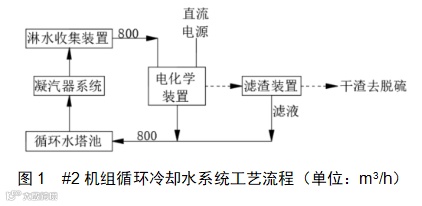 某电厂#1机组循环冷却水系统未设置电化学处理装置,#2机组循环冷却水系统设置处理能力为2×400m3/h的电化学装置(处理水量占循环水量的比例约为1%,停留时间约为10min),电化学装置进水来自于淋水收集装置,来水自流进入电化学装置,电化学装置出水返回塔池。电化学装置阳极、阴极均采用板式极板,材料为钛板镀贵金属。采用倒极法去除阴极板上的积垢,倒极后极板上的积垢被剥离下来,沉积在电化学装置底部后排入滤渣槽,定期通过人工方式将滤渣槽内的渣垢送至脱硫制浆系统进行综合利用,#2机组电化学处理工艺流程见图1。