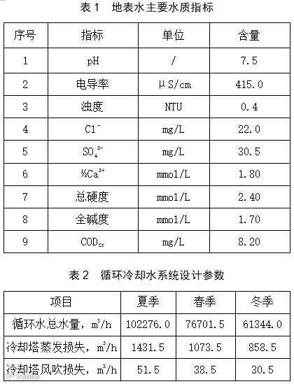 某电厂机组凝汽器换热管材质为TP304,循环冷却水系统补充水主要为地表水(经混凝澄清过滤处理后补充至循环冷却水系统),地表水水质年度变化较小,主要水质指标见表1。循环冷却水系统主要设计参数见表2。