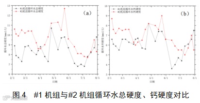 当机组运行负荷、循环冷却水系统补水水质保持一致的情况下,#1机组循环冷却水系统浓缩倍率控制在4倍左右、未设置电化学装置,#2机组循环冷却水系统浓缩倍率控制在6倍左右、设置电化学装置,对#1、#2机组循环冷却水系统总硬度、钙硬度、碱度、浊度等指标进行取样分析,两种工况下循环冷却水系统水质变化趋势分别见图4~图5。