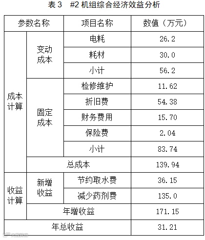 该电厂#2机组循环冷却水电化学除垢项目总投资约为800万元,该工程实施后,循环冷却水系统浓缩倍率可以由4倍提高至6倍,年总成本增加139.94万元、年新增收益171.15万元,年总收益约为31.21万元,经济效益明显,#2机组综合经济效益分析见表3(折旧年限取15年)。