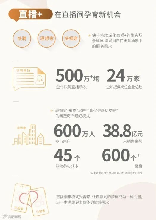 同时,线上相亲、直播招聘与购房直播也成为平台特色。2022年全年,快聘直播超500万场,入驻企业达24万家。“快手购房节”活动中,600万用户参与互动,覆盖45个城市,总成交金额达38.8亿元。