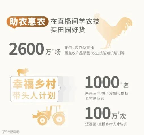 在助农方面,“幸福乡村战略”推动超2600万场涉农直播,涵盖农产品销售与农业技能培训。未来三年,“幸福乡村带头人计划”将持续扶持超过1000名乡村创业者,并开展超百万人次的短视频+直播人才培训。