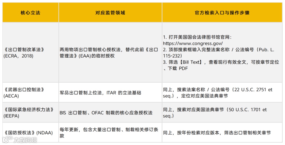 美国出口管制法律体系分为 4 个层级,检索需遵循上位法优先、现行有效规则优先的原则,避免适用过期 / 无效规则。