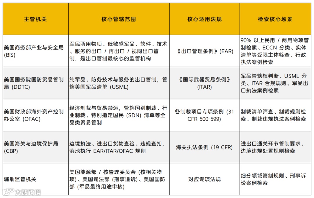 一:检索的核心前提是明确管辖主体与适用范围,避免跨体系混淆检索。美国出口管制实行分机关分领域监管,核心主管机关及管辖边界如下: