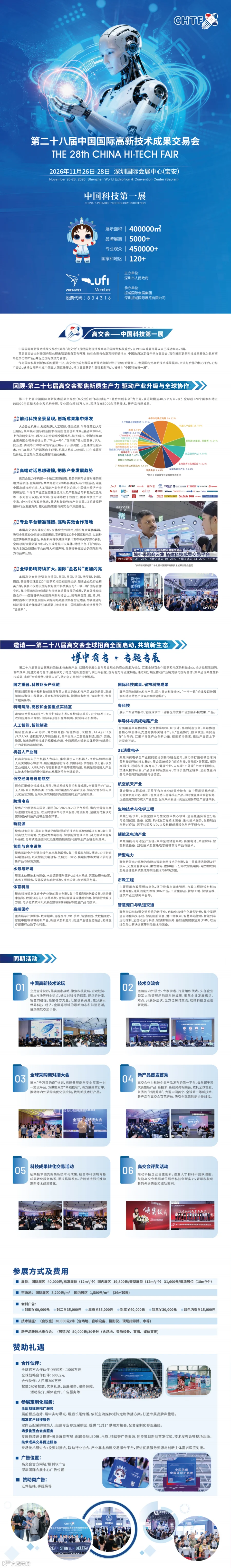 第28届高交会拟于2026年11月26日至28日在深圳国际会展中心(宝安展区)举办,展出面积达40万平方米。展会以“博中有专、专题专展”为原则,设置23个专业展区,涵盖国之重器、科技巨头产业链、省市及国际科技成果、人工智能与机器人、半导体与集成电路、商业航天与低空经济、消费电子、新型电力、储能、氢能、充电桩、水务与环境、港口物流交通、未来建筑等方向,全面呈现全球前沿技术趋势与产业化成果 [2] 。