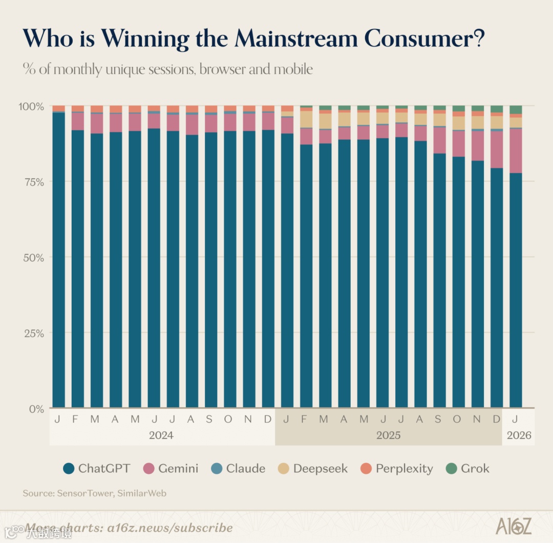 例如 Gemini 和 Claude 增长迅速,尤其是在移动端和订阅用户规模上,正在一步步逼近 ChatGPT。