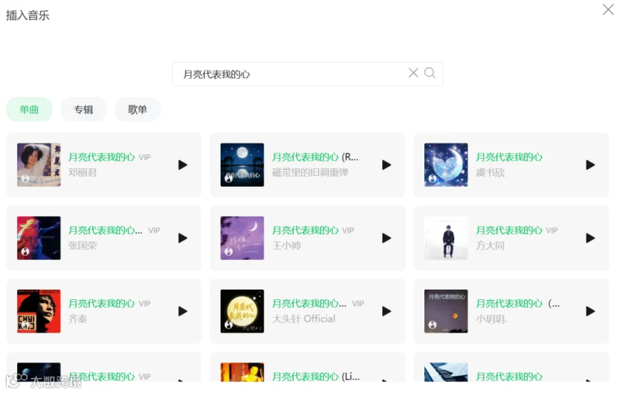 在搜索框输入歌曲名+歌手(比如“月亮代表我的心 邓丽君”),找到对应的歌曲,点击“插入”;