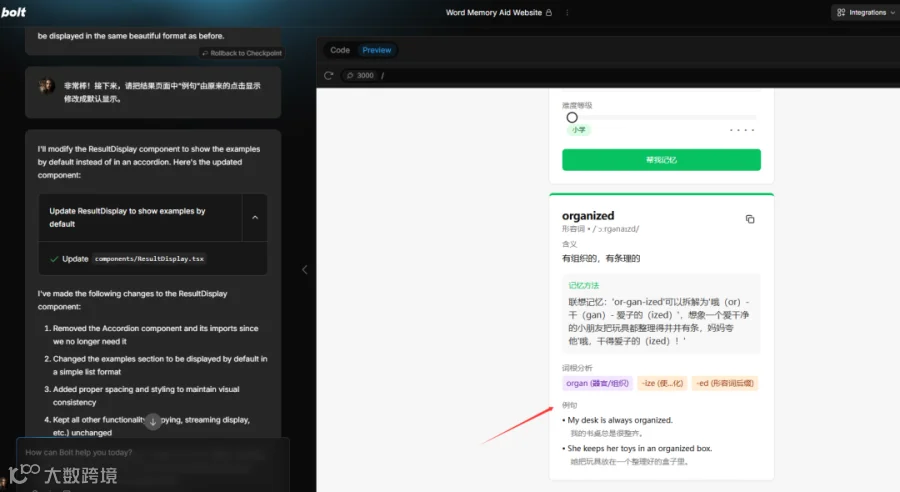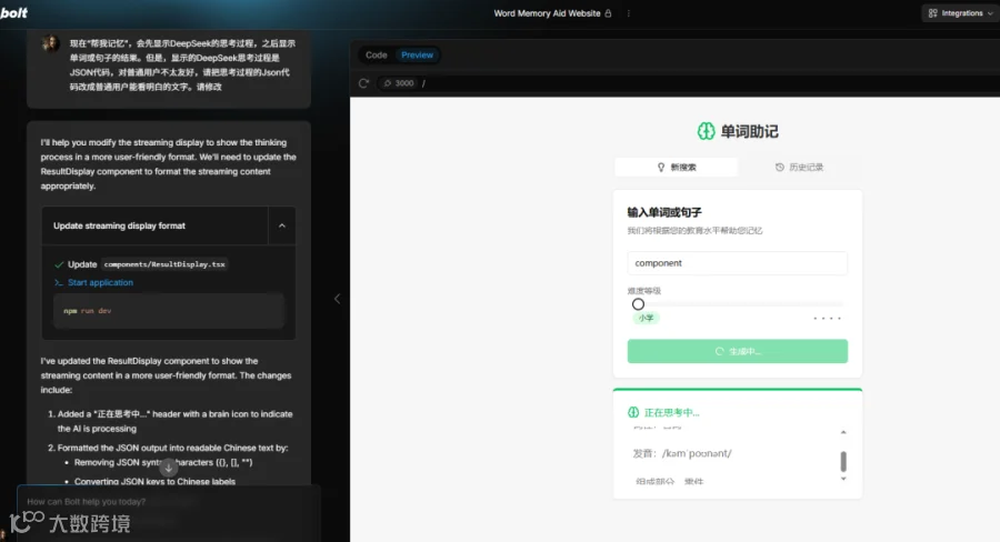 我按小排老师提供Prompt模板整理好这个需求的Prompt,使用的是openrouter.ai的deepseek/deepseek-chat模型,示例代码来源于Openrouter的API示例。把Prompt粘贴到Bolt.new中执行,很快就能得到这个网站的初始版本,再和它简单沟通修改一下,就能得到一个简单的单词助记网站: